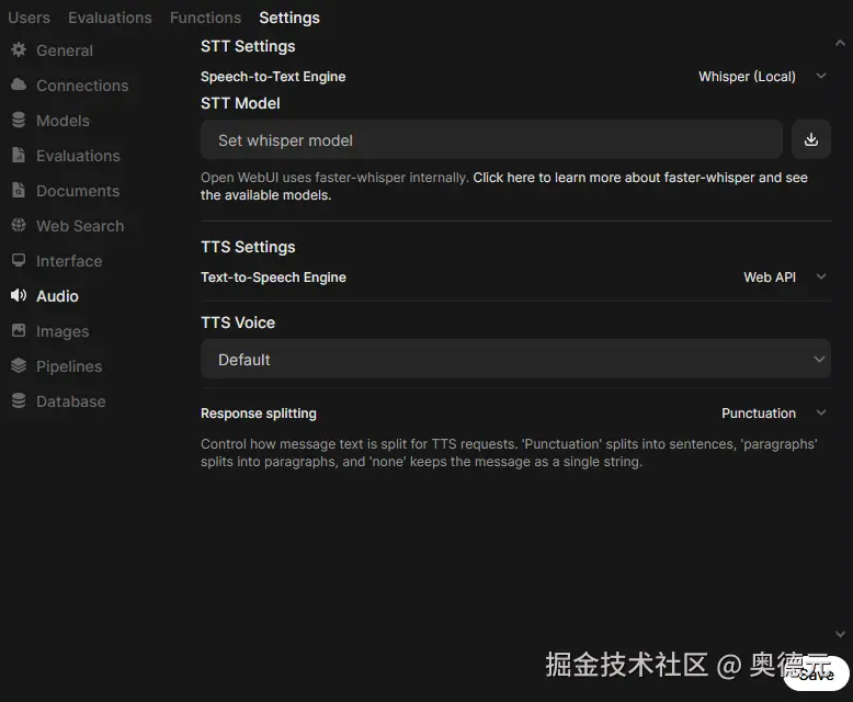 先得启用一下Open WebUI的STT(Speech To Text)语音转文本的功能,用管理员登录进去,然后点OpenWebUI的右上角Admin Panel(管理面板)设置,再到Setting的Audio设置项,如下图所示,先在STT Model那里填一个wisper模型名,如:base(截图的时候忘记填了),然后点击一下那个下载按钮。