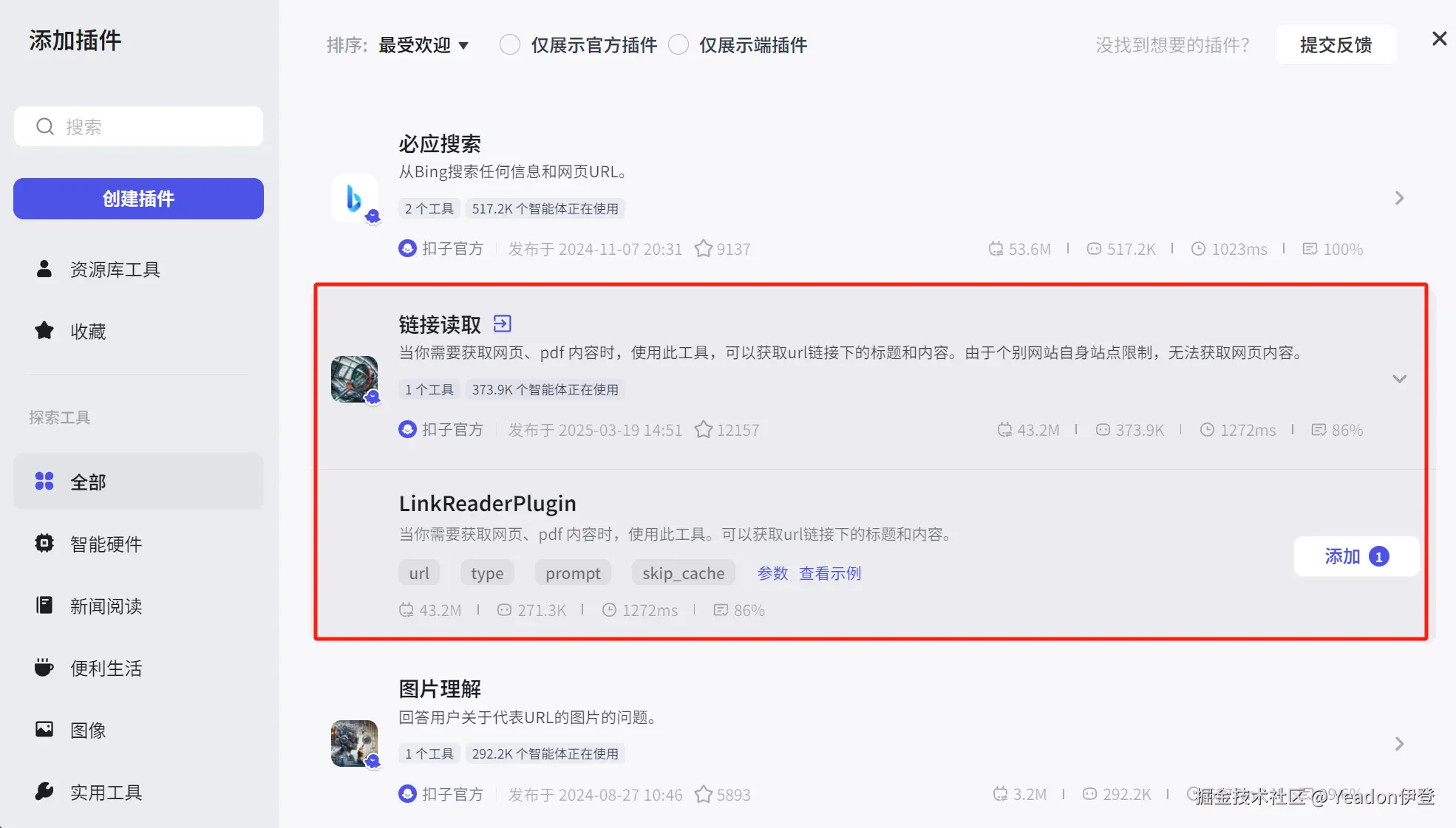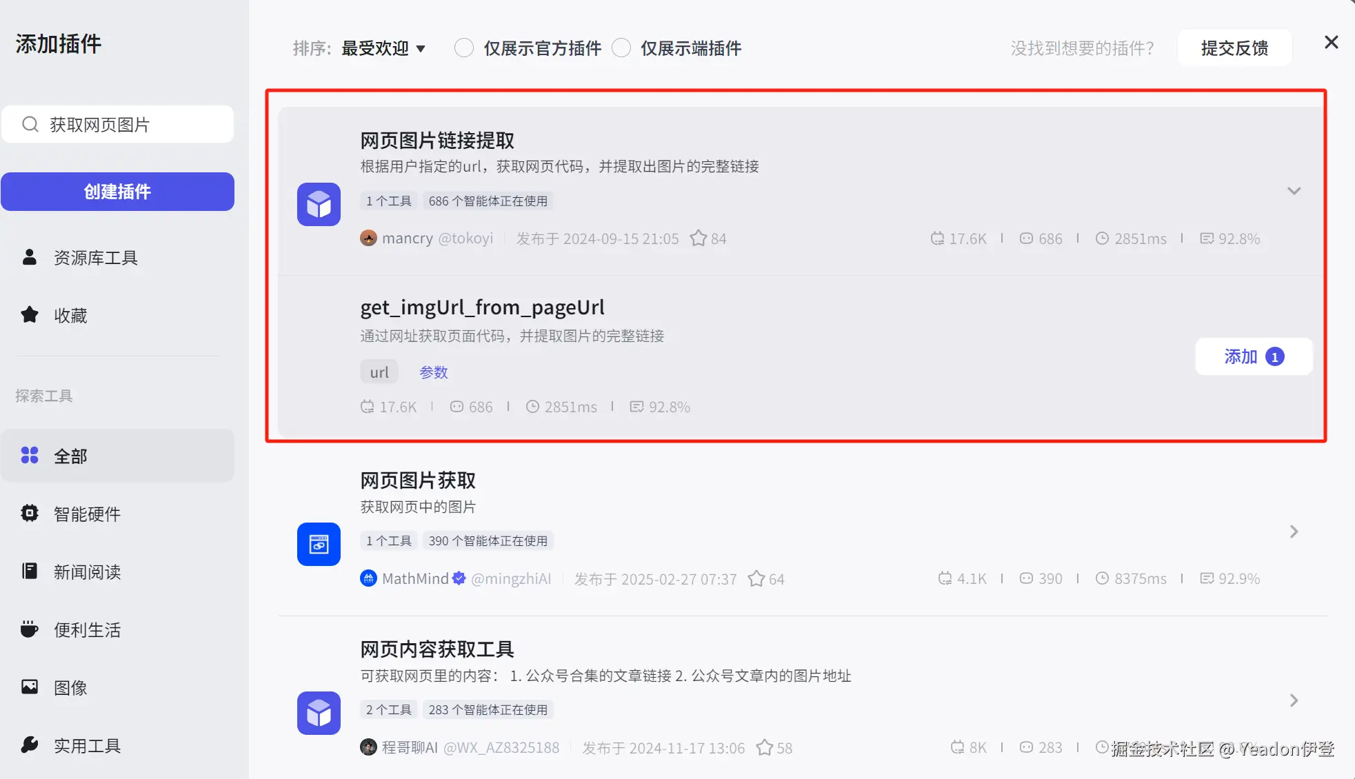 - 搜索并选择一个能从网页 URL 提取图片链接的插件。(示例中使用 get_imgUrl_from_pageUrl,你可以根据目标网页类型,如公众号文章,寻找更合适的插件)。