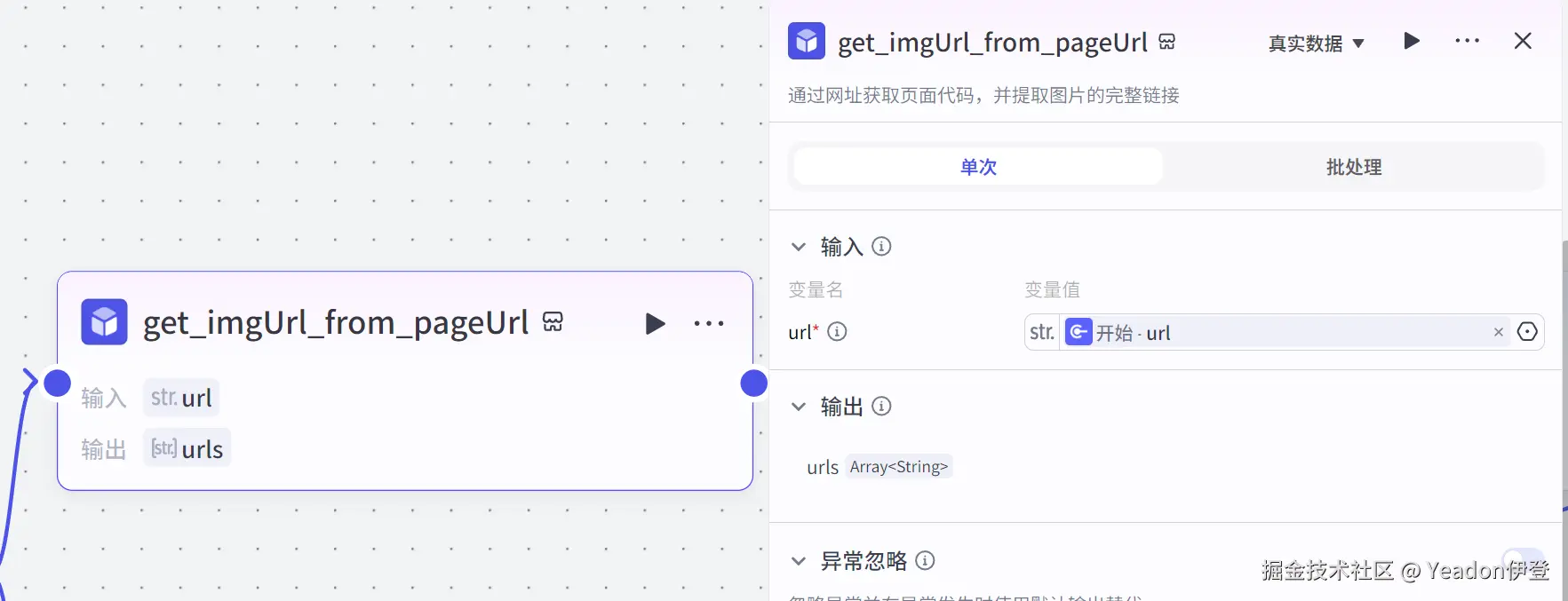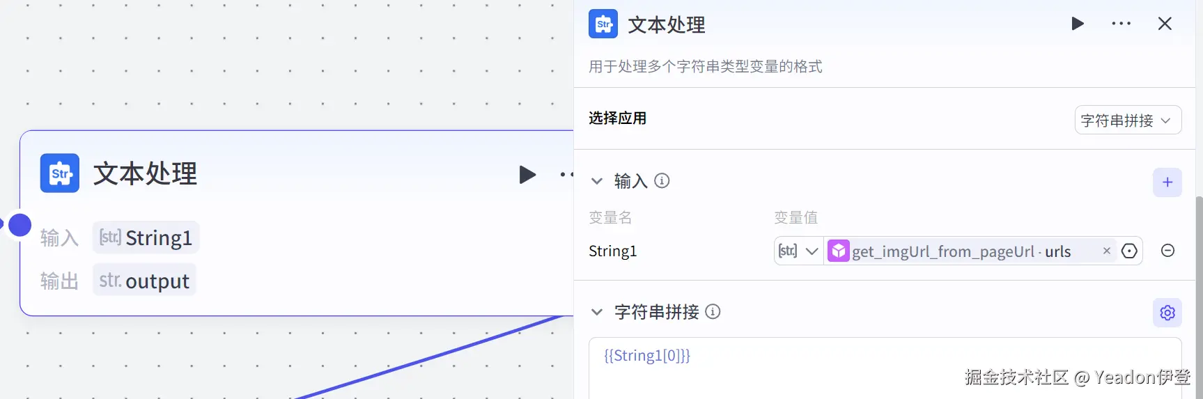 - 处理逻辑:使用字符串拼接功能,提取数组中的第一个元素 {{String1[0]}}。这样我们就得到了第一张图片的链接。