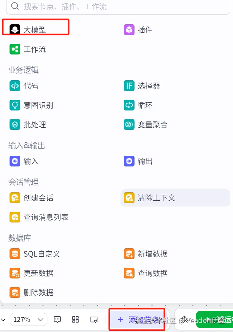 - 添加“大模型”节点。