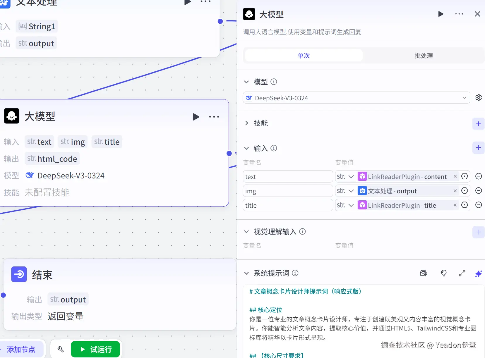 通过 Coze 的可视化编排能力和 DeepSeek V3 强大的代码生成能力,我们成功地将一个原本需要专业设计师和前端工程师协作完成的任务,变成了一个自动化的流程。