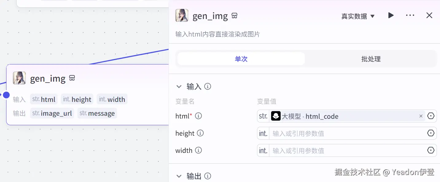 - img: 类型 String,引用上一步“文本处理”节点的 output (第一张图片链接)。