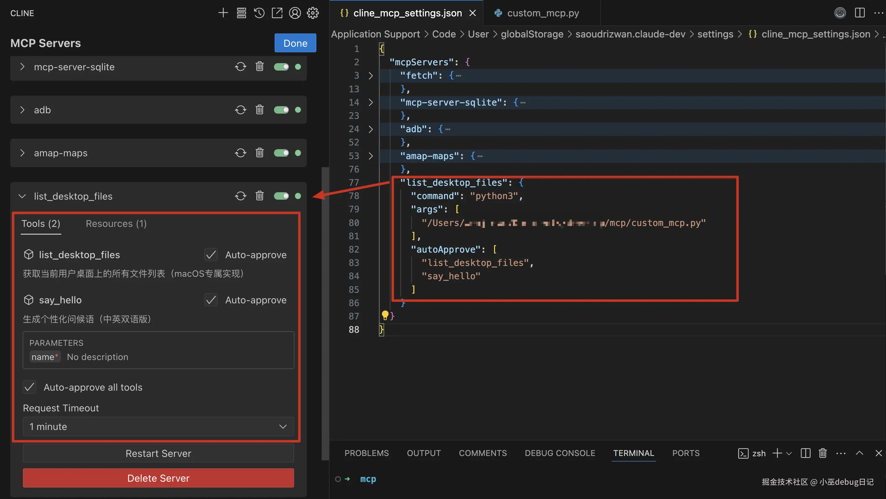 - 以CLINE为例,在设置中添加MCP服务器路径(如