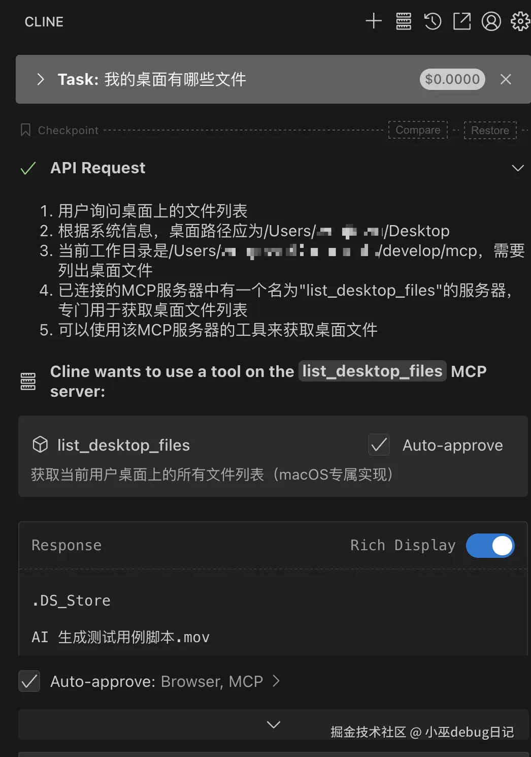 - 刷新客户端后,通过自然语言指令(如“我的桌面有哪些文件”)调用工具。