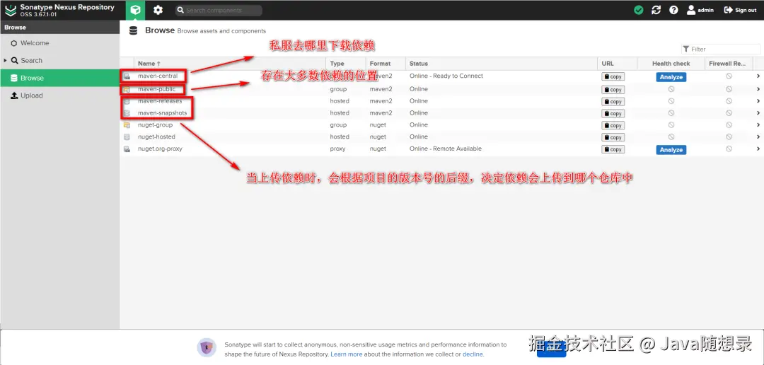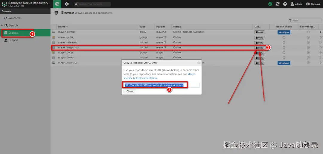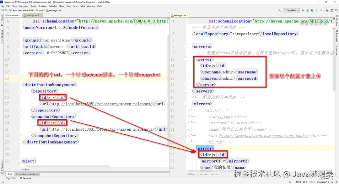 首先在Maven私服的位置,找到release和snapshot的仓库地址