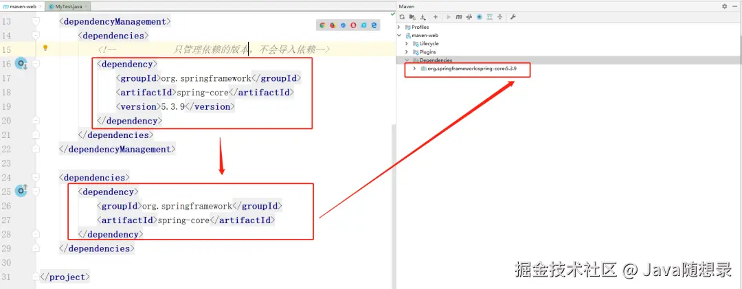 dependencyManagement标签只会声明版本,不会将依赖导入,导入依赖依然需要借助dependencies
