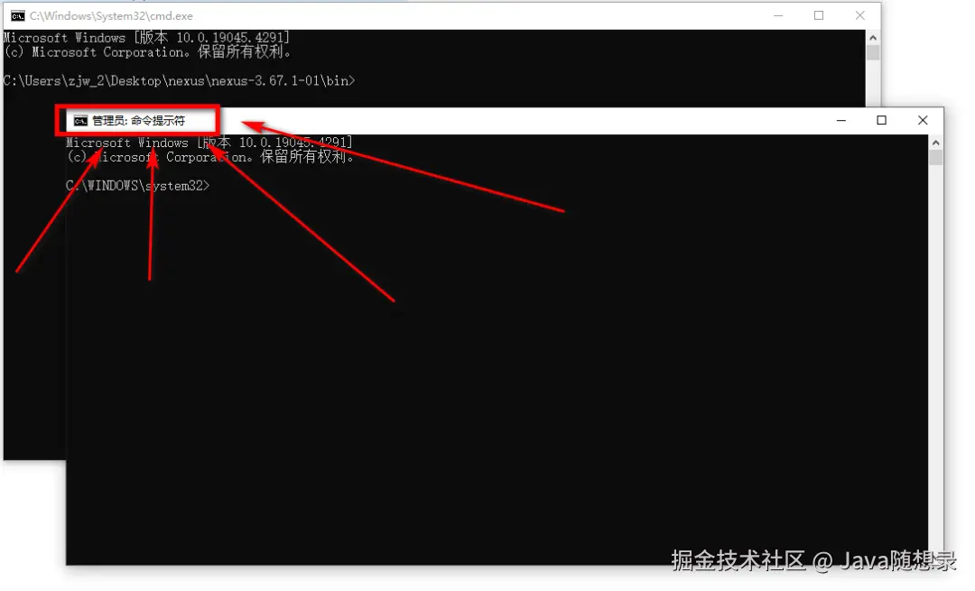 启动时,需要基于doc窗口去运行Nexus私服,但是一定要以 超级管理员 的身份打开cmd。