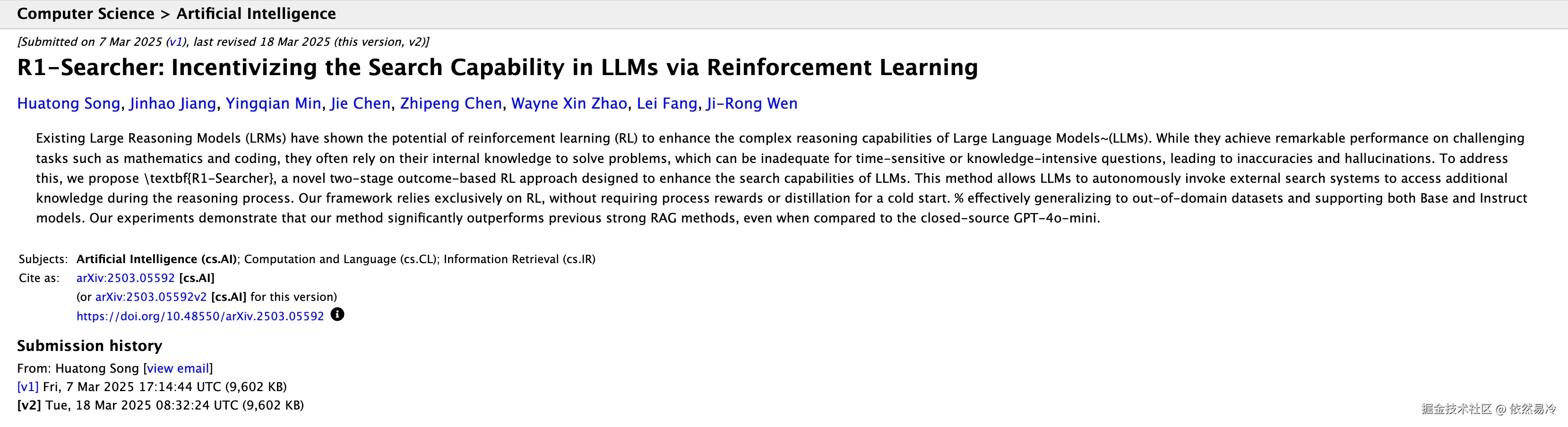 最近(2025年3月)出现了几篇Paper,都提到了如何教LLM学会在思考问题时,自己决定什么时候利用外部搜索引擎查资料,来增强其面对更复杂问题下的推理能力,无一例外都使用了RL,下面是每篇论文的分享链接。