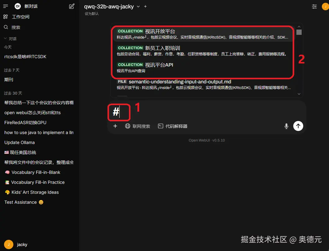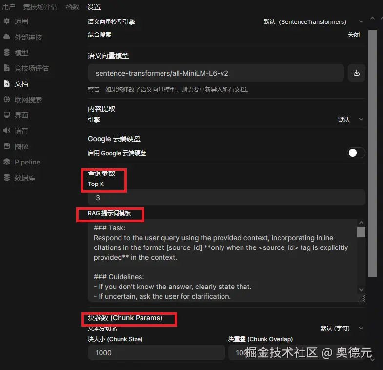 在明确了大模型(QwQ-32B-AWQ)和向量库(sentence-transformers/all-MiniLM-L6-v2)后,整个RAG应用的开发关键在于本地知识的整理和提示词的设计,在open-webui上可以看到相关的一些设定。