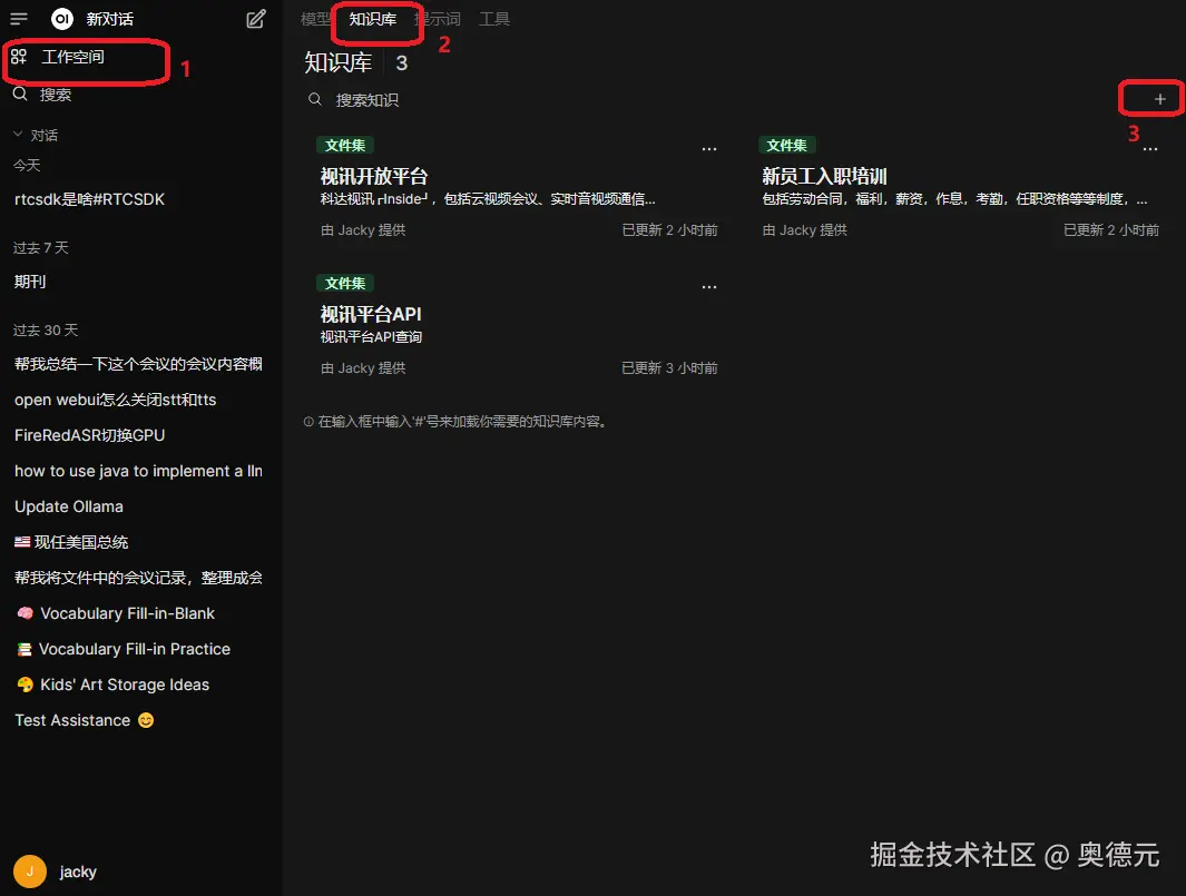 - 点右侧的"+"号新增知识库(可以是个人私有的,也可以是公开的)