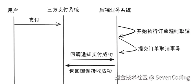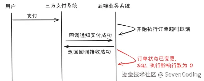 这种情况在正常的业务场景中是有可能出现的,因为订单都会有定时取消的逻辑,比如10 分钟或者 15分钟,而用户刚好卡在这个时间点进行付款,此时就会出现两种情况: