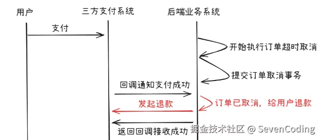 - 用户支付成功,支付回调的那一刻支付单刚好还没取消,而等回调结束,取消支付单的事务提交,支付单取消。此时用户扣款了,但是对应的权益或资产没了。