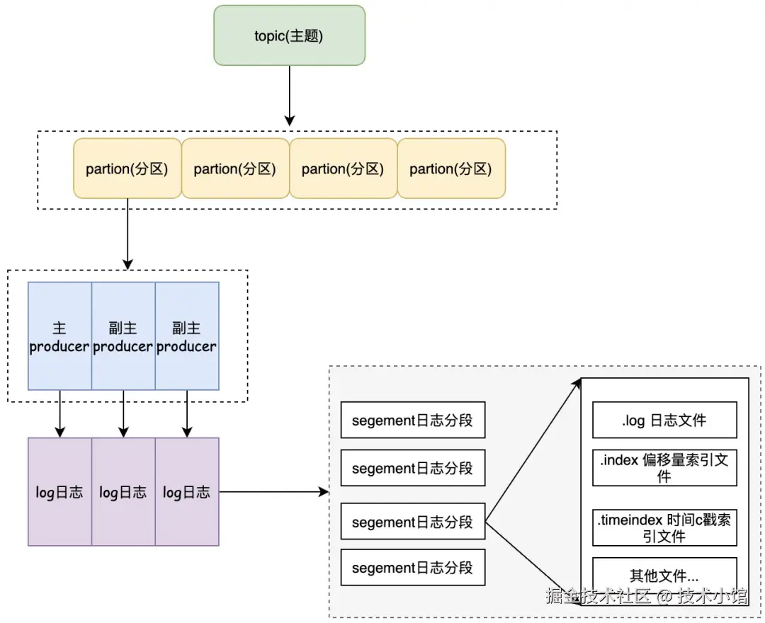 Kafka的日志文件被设计为分段结构(Segmented Logs),每个分区的日志被分割成多个小段(Segment),每个段有自己的索引文件。这种设计不仅优化了日志管理,还提升了索引查找的效率。