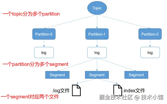 Kafka使用分段日志机制(Segmented Log Mechanism)来管理分区中的日志文件,每个分区的日志被分割成多个较小的段(Segment)。每个段都有其对应的索引文件,这种设计使得Kafka可以在日志文件变得非常大的情况下仍然保持高效的索引和数据检索性能。