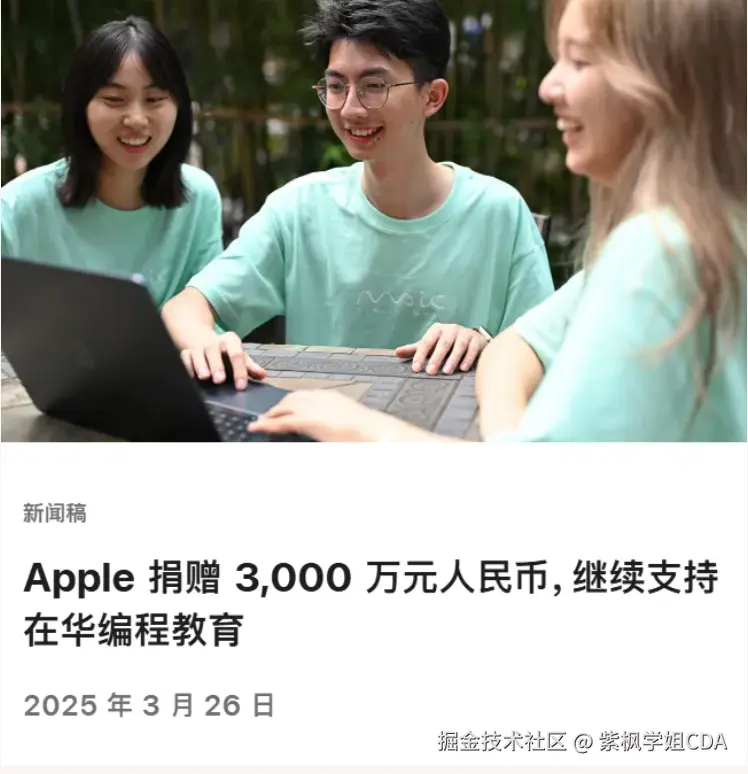 苹果向浙大捐赠 3000 万元支持编程教育,不仅为学生开发者提供了难得的学习和发展机会,也为编程与数据分析教育的发展注入了新的活力。
