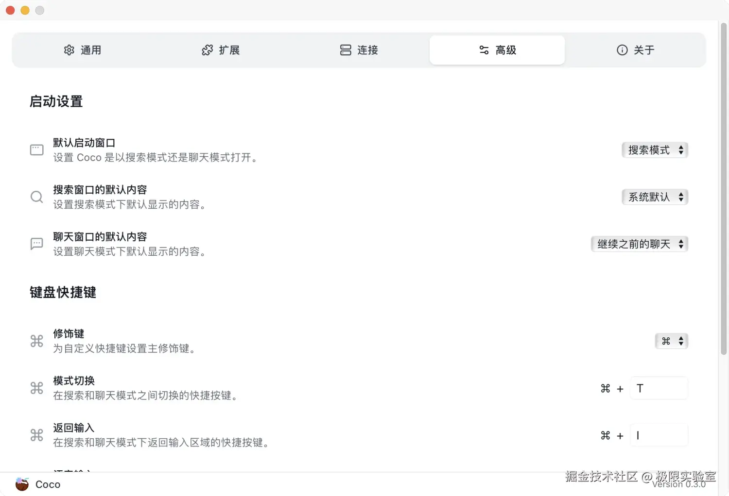 - Coco AI v0.3 作为 开源、跨平台的 AI 搜索工具,新增快捷键设置,支持多个聊天会话等功能。