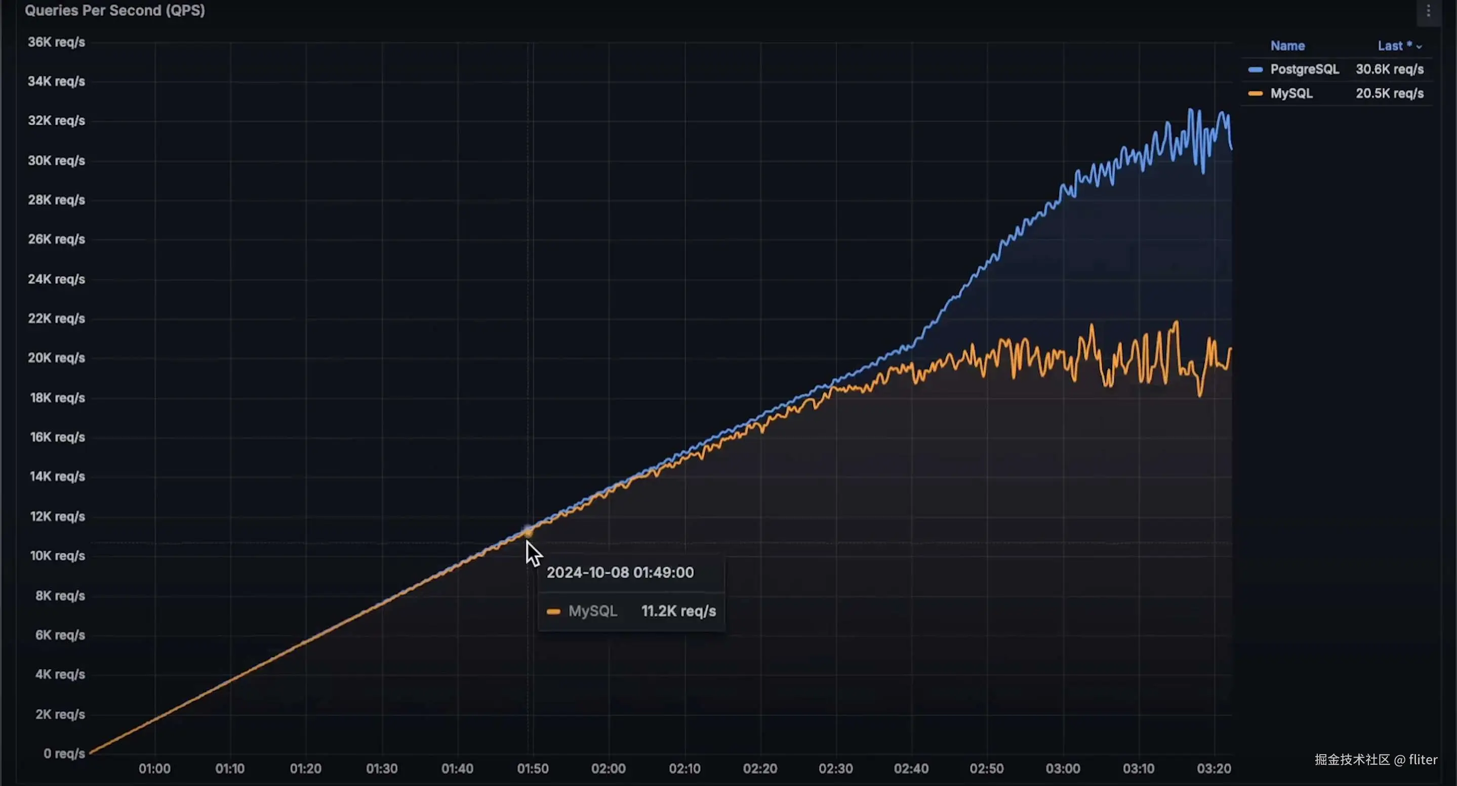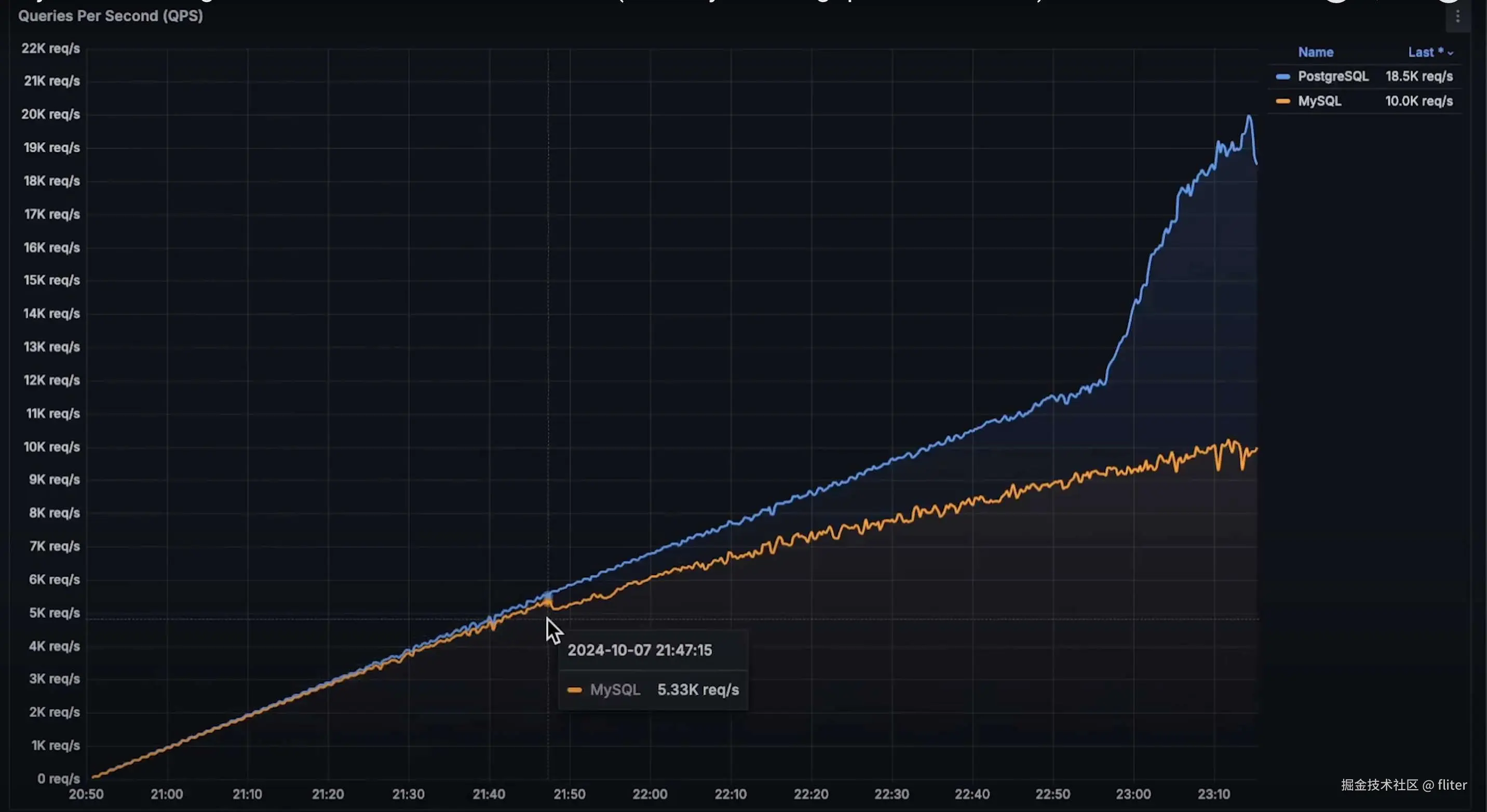 - 当 QPS 达到 5,500 时,MySQL 开始跟不上 PostgreSQL