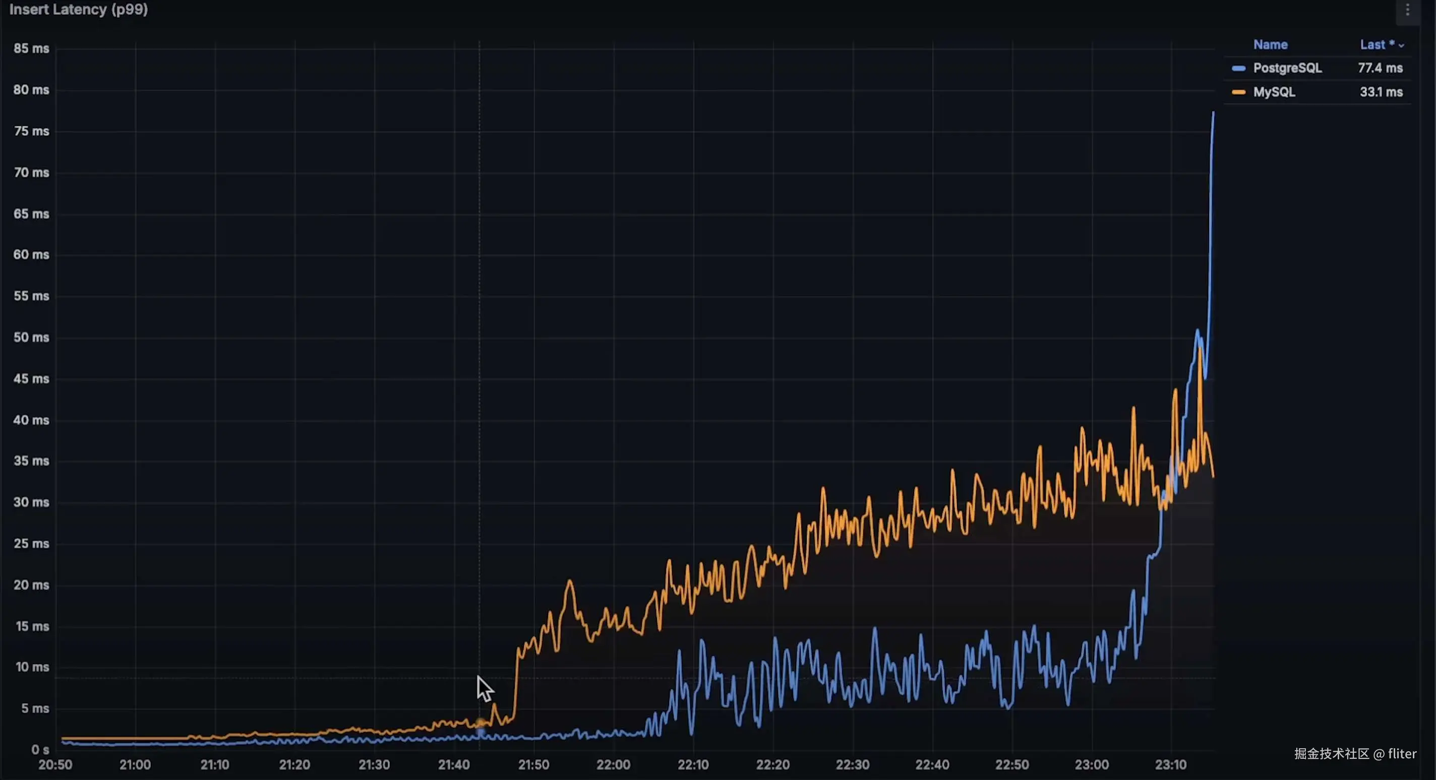 - 从一开始,PostgreSQL 的插入延迟明显低于 MySQL
