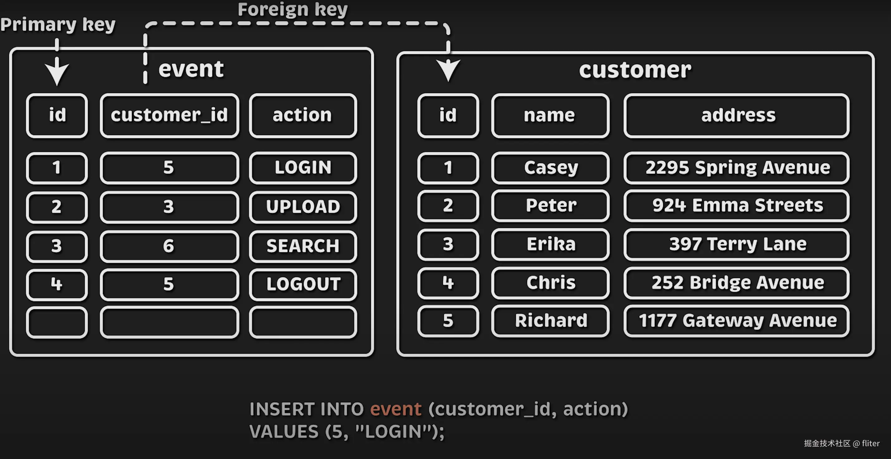 我们将使用以下 SQL 语句插入数据,随机生成客户 ID 和操作类型。