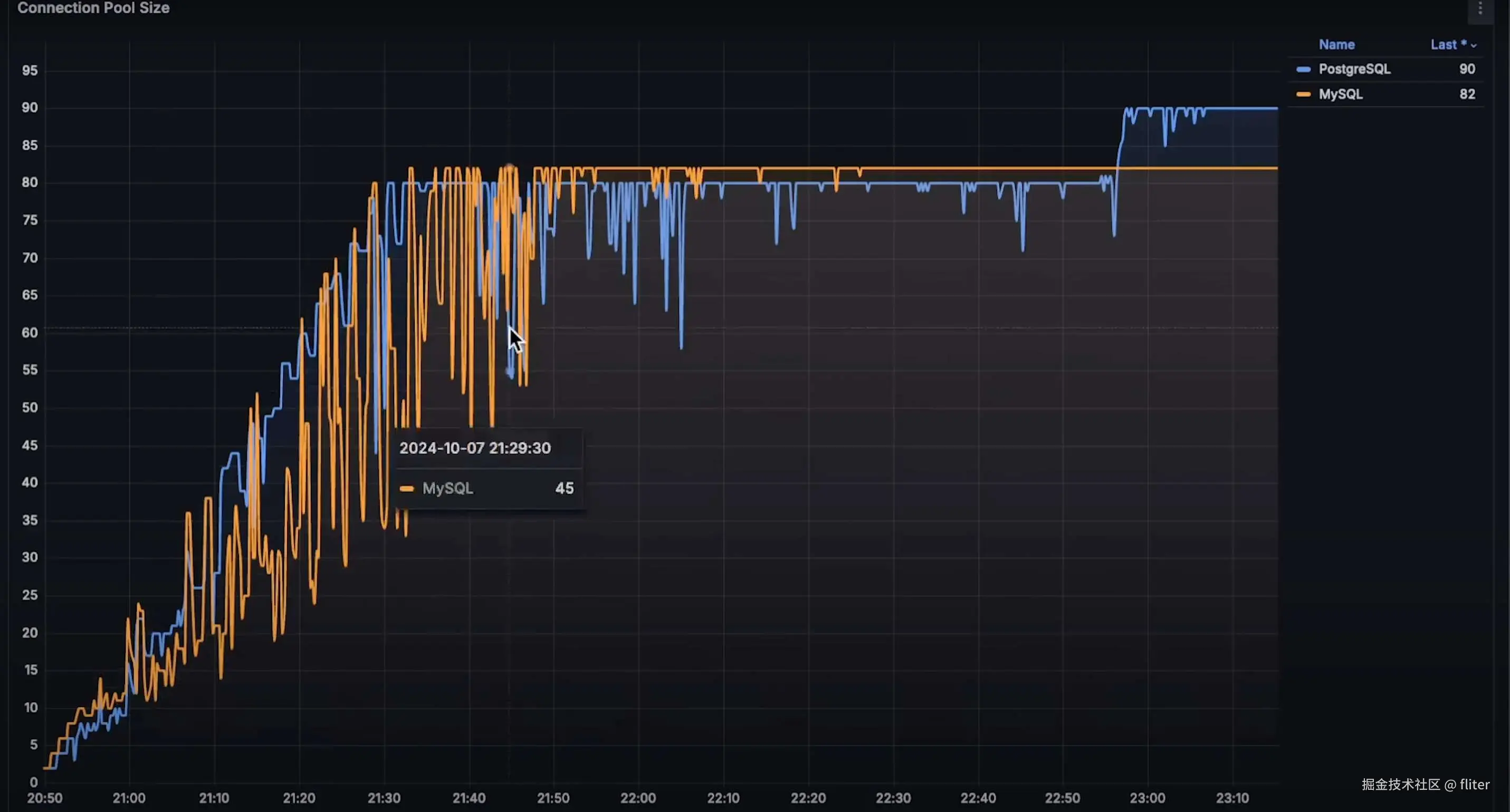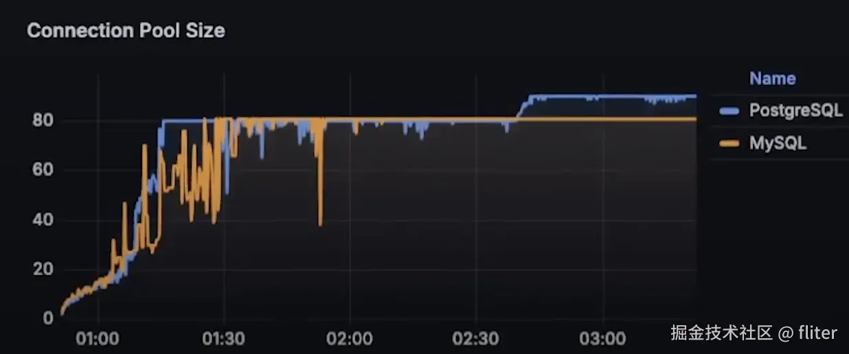 - 两个数据库的连接池最终都达到了 80 个连接