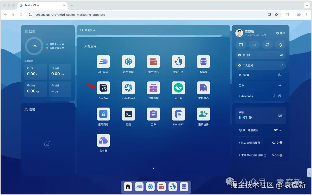登录Sealos账号,在Sealos首页中的「所有应用」里点击「DevBox」选项,进行项目的创建操作,如下图所示。