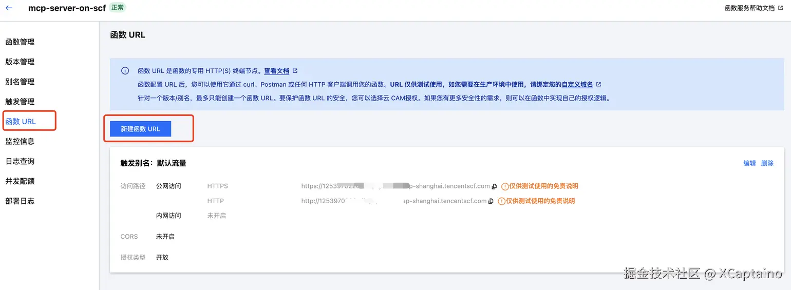 最后一步创建函数的URL,使用该URL提供给mcp client进行sse方式的访问: