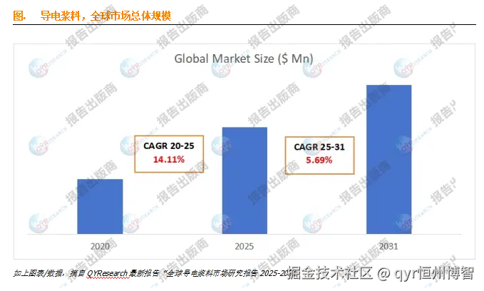 根据QYResearch最新调研报告显示,2025年全球导电浆料市场规模大约为11,028.6百万美元,预计2031年将达到15,371.7百万美元,未来几年年复合增长率CAGR为5.7%.