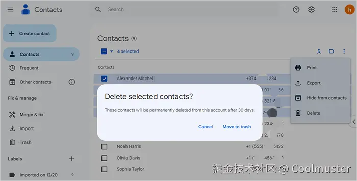 步骤 4. 单击弹出窗口中的“移至垃圾箱”确认操作。确认后,所选联系人将从您的 Google 帐户和所有同步设备中删除。
