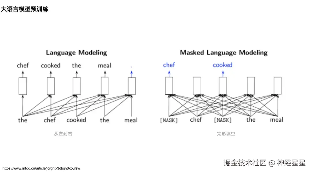 大多数 AI + 蛋白质的研究都可以追溯到自然语言处理的研究,所以我们先来回顾一下自然语言处理 (NLP) 领域的两个经典语言模型:一个是以 GPT 系列为代表的单向语言模型, 其机制是基于从左到右的信息流动方式,根据左侧的数据(上文)预测下一个 token。一个是以 BERT 为代表的双向语言模型, 其通过 Masked Language Model 做预训练,可以看到某个 cooked 左右两侧的信息(上下文),从而预测该 cooked。