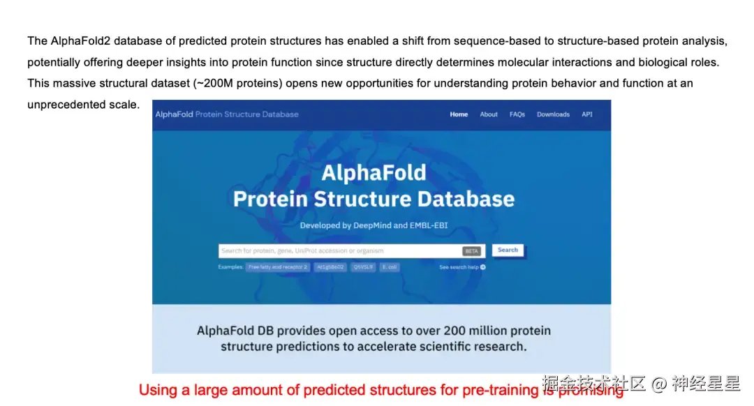 其实,大多数蛋白质语言模型的输入信息主要基于氨基酸序列。在 AlphaFold 取得突破后,DeepMind 团队与欧洲生物信息研究所 (EMBL-EBI) 合作,发布了 AlphaFold 蛋白质结构数据库 (AlphaFold Protein Structure Database),其中存储了 2 亿的蛋白质结构。于是我们开始考虑:能否将蛋白质的结构信息整合到语言模型中,以提升其性能表现?