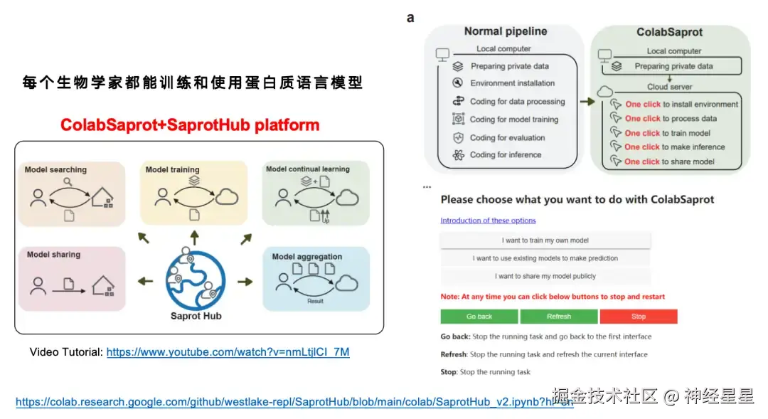 虽然我们认为 SaProt 模型还不错,但考虑到许多生物学家并未接受深度学习相关的训练, 让他们独立微调一个规模达 10 亿参数左右的蛋白质语言模型是非常困难的,于是我们构建了一个交互界面式平台 ColabSaprot + SaprotHub。