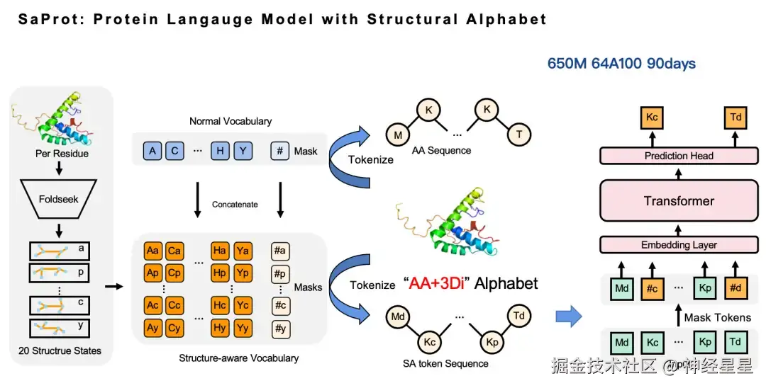 我们的做法非常简单:采用 Foldseek,将蛋白质的结构信息从坐标形式转换为离散 token,从而构建氨基酸词表和结构词表,然后对这两个词表进行交叉组合,生成新的词表,也就是结构感知词汇 (Structure-aware Vocabulary, SA token)。这样一来,原本的氨基酸序列就可以转化为一种新的氨基酸序列——在这个序列中,大写字母代表氨基酸 token,小写字母代表结构 token,然后,就可以继续做 Masked Language Model 了。基于此,我们训练了一个 6.5 亿参数的 SaProt 模型,该模型使用了 64 张 A100 GPU,总训练时间约 3 个月。