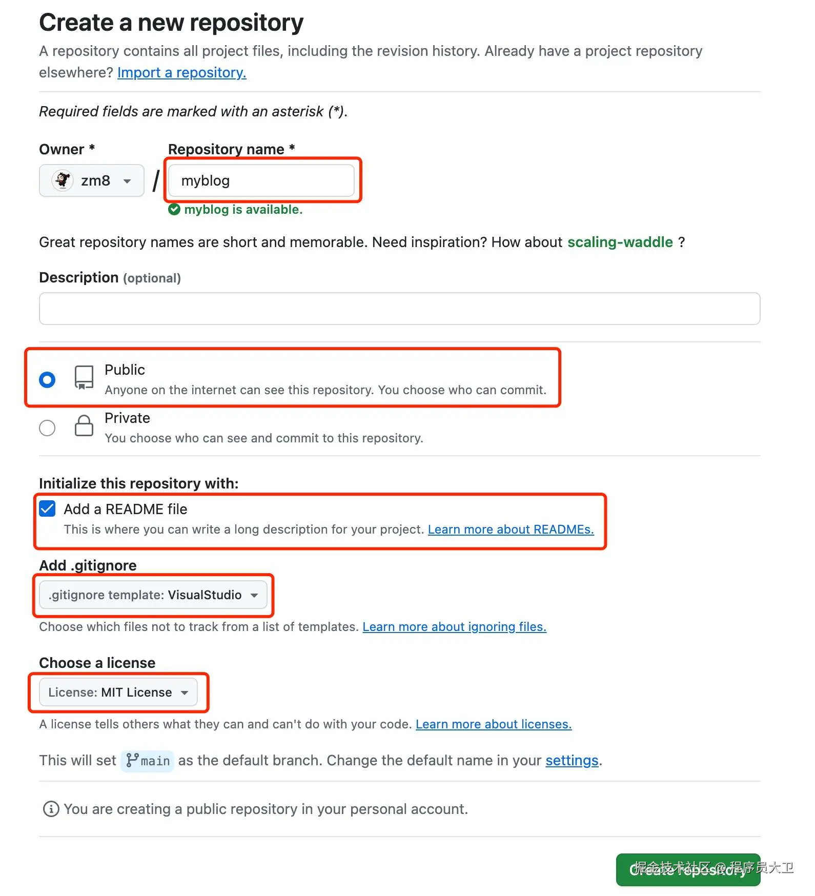 创建一个公开仓库,名称为 myblog。