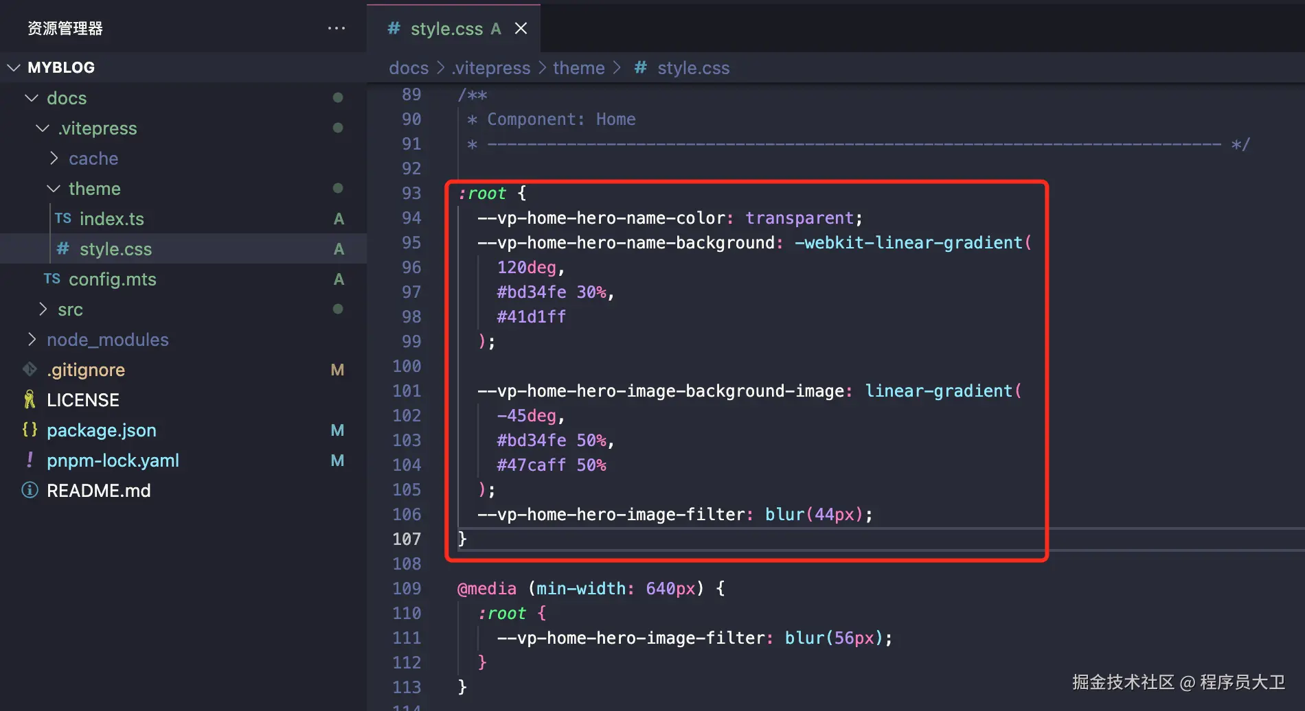Logo图片和My Awesome Project的背景样式,是在docs/.vitepress/theme/style.css中定义的 CSS 变量控制的: