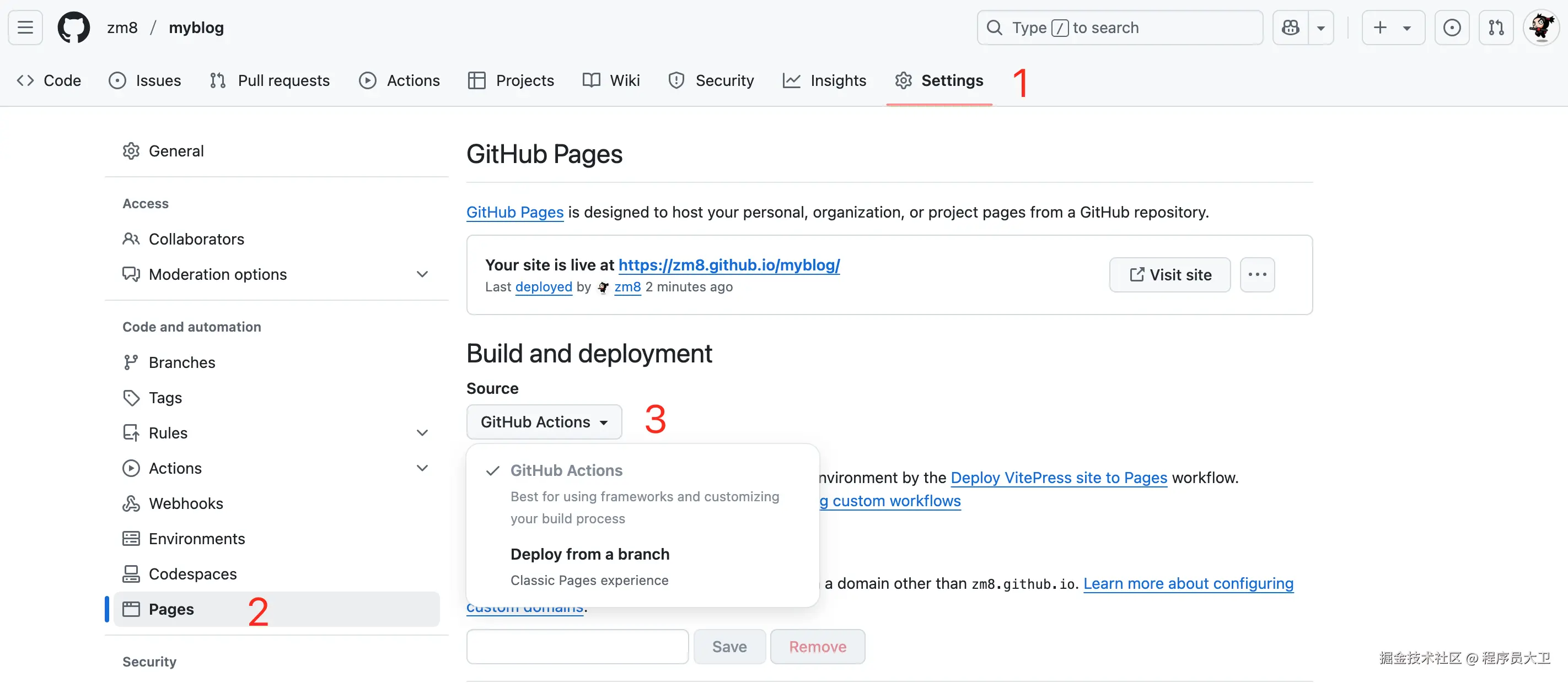 进入 myblog 仓库的 Settings,选择左侧菜单栏中的 Pages,然后在 Build and deployment 的方式中选择 GitHub Actions。