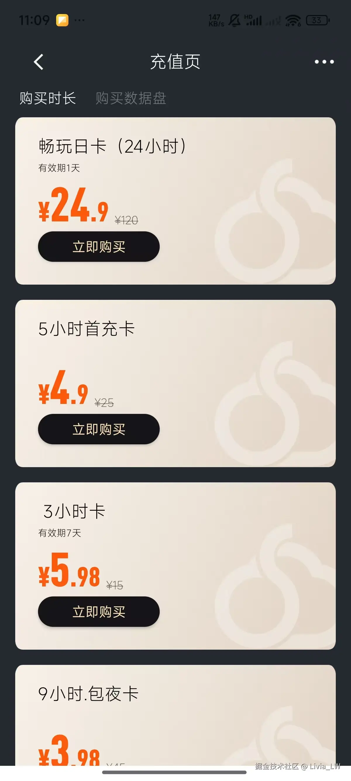 | 5小时首充卡 | ¥25 | ¥4.9 | 1天 |