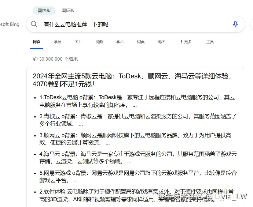 我留意到云电脑概念开始流行,抱着「把电脑装进口袋」的好奇心,果断在搜索框敲下「有什么云电脑推荐一下的吗」。排在搜索结果前列的几款主流云电脑——ToDesk云电脑、顺网云、青椒云等,很快引起了我的注意。