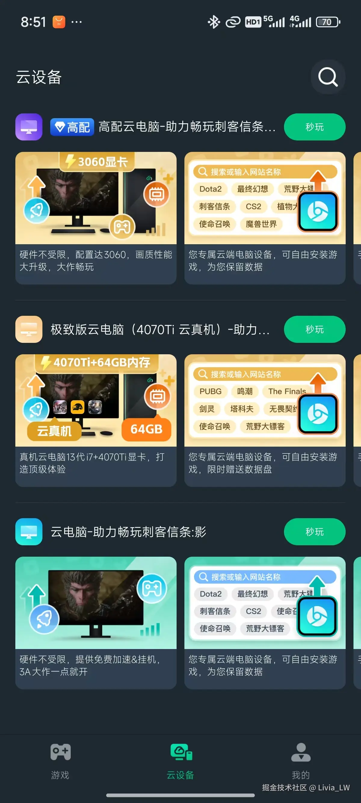界面简洁清晰:可以轻松浏览游戏、云设备等不同功能板块,信息传递直接明确。