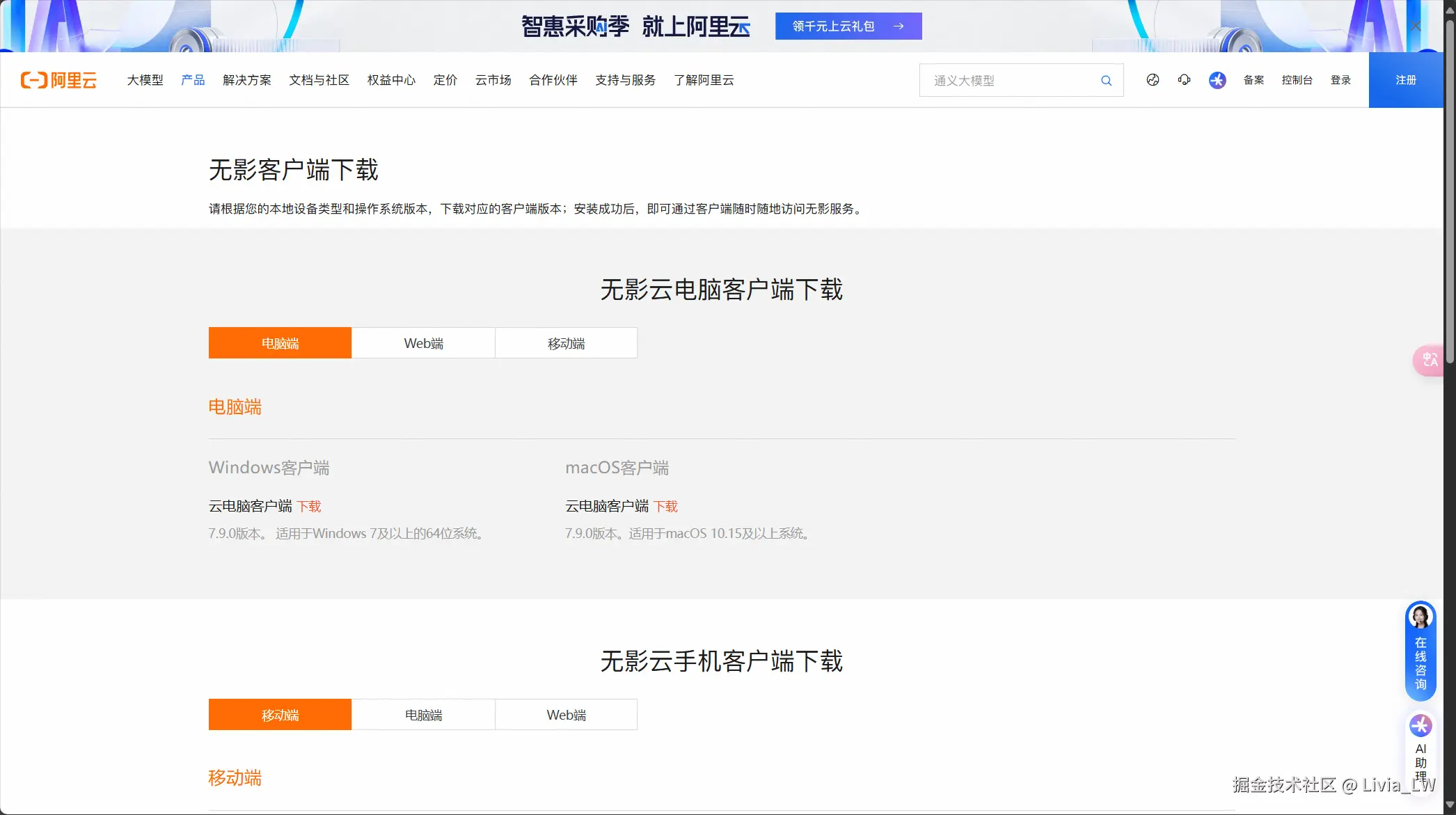 我们搜索无影云进入网站之后,这边我们也是可以发现无影云是兼容多种设备的(Windows、macOS、Android、iOS、Web),和ToDesk云电脑的兼容性相似。