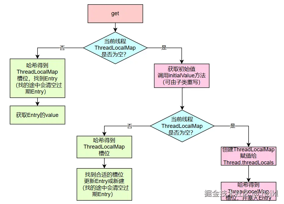 Entry的key指向ThreadLocal(弱引用),value就是我们set的值(强引用)。