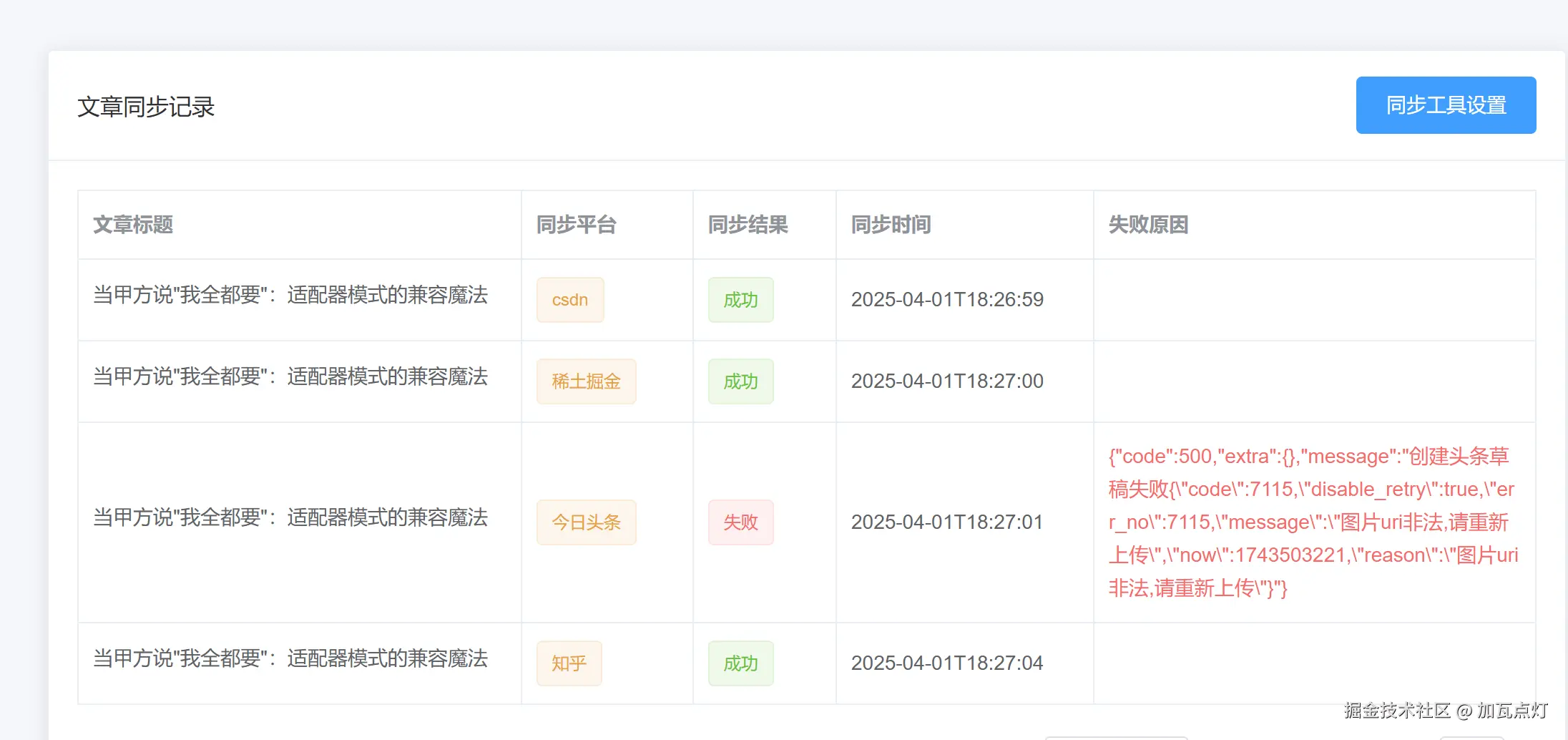 肉眼可见的繁琐, 然后想去找找看看有没有开源的工具,有是有,要么年久失修,没人维护,例如wechatSync工具; 要么就是没有我想要的同步的平台,例如:mdnicep平台; 该平台,经常失败,而且不能同步掘金,于是一怒之下,就自己开发了一个工具。