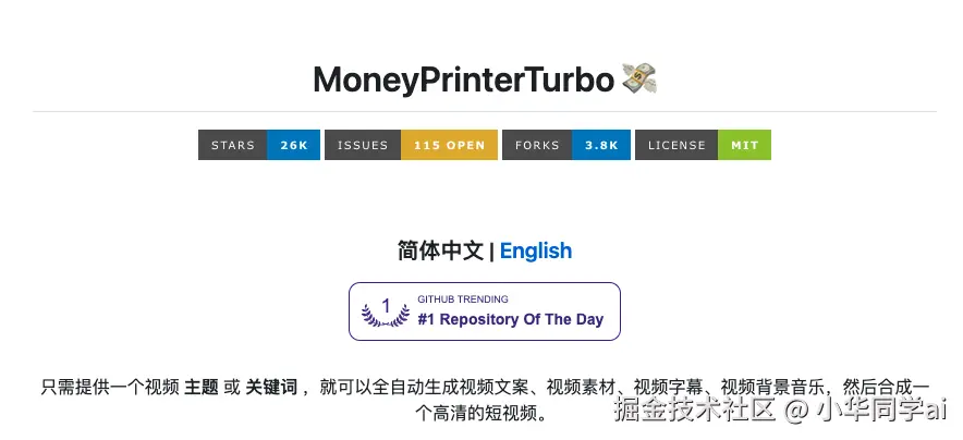 | MoneyPrinterTurbo | 全流程自动化/开源可定制 | 需配置本地环境 | MIT |