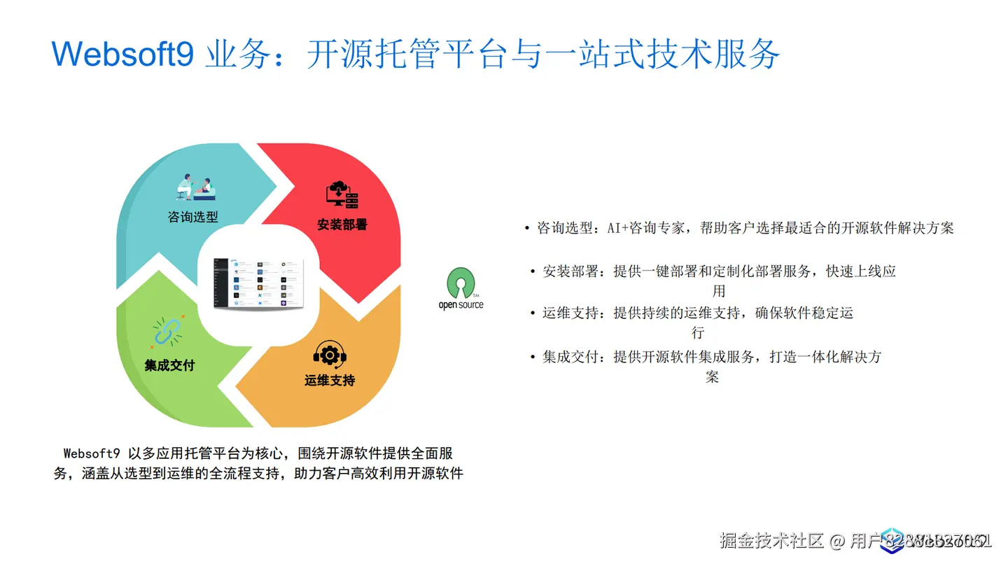 Websoft9已形成覆盖400+开源软件的技术矩阵,服务全球70个国家客户。通过「平台+服务+生态」三位一体模式: