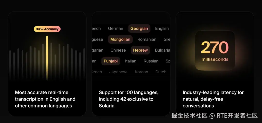 广泛的语言覆盖: 支持超过 100 种语言,其中包括 Solaria 独有的 42 种语言,并提供媲美母语的音质。