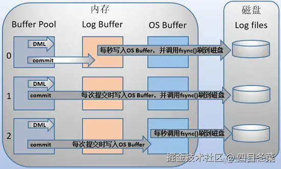 | 2(实时写,延迟刷) | 每次提交都仅写入到os buffer,然后是每秒调用fsync()将os buffer中的日志写入到redo log file。 |