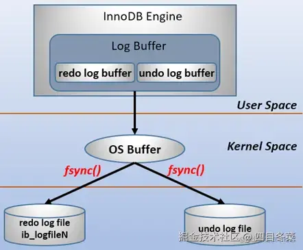 在计算机操作系统中,用户空间(user space)下的缓冲区数据一般情况下是无法直接写入磁盘的,中间必须经过操作系统内核空间(kernel space)缓冲区(OS Buffer)。因此,redo log buffer写入redo log file实际上是先写入OS Buffer,然后再通过系统调用fsync()将其刷到redo log file中,过程如下: