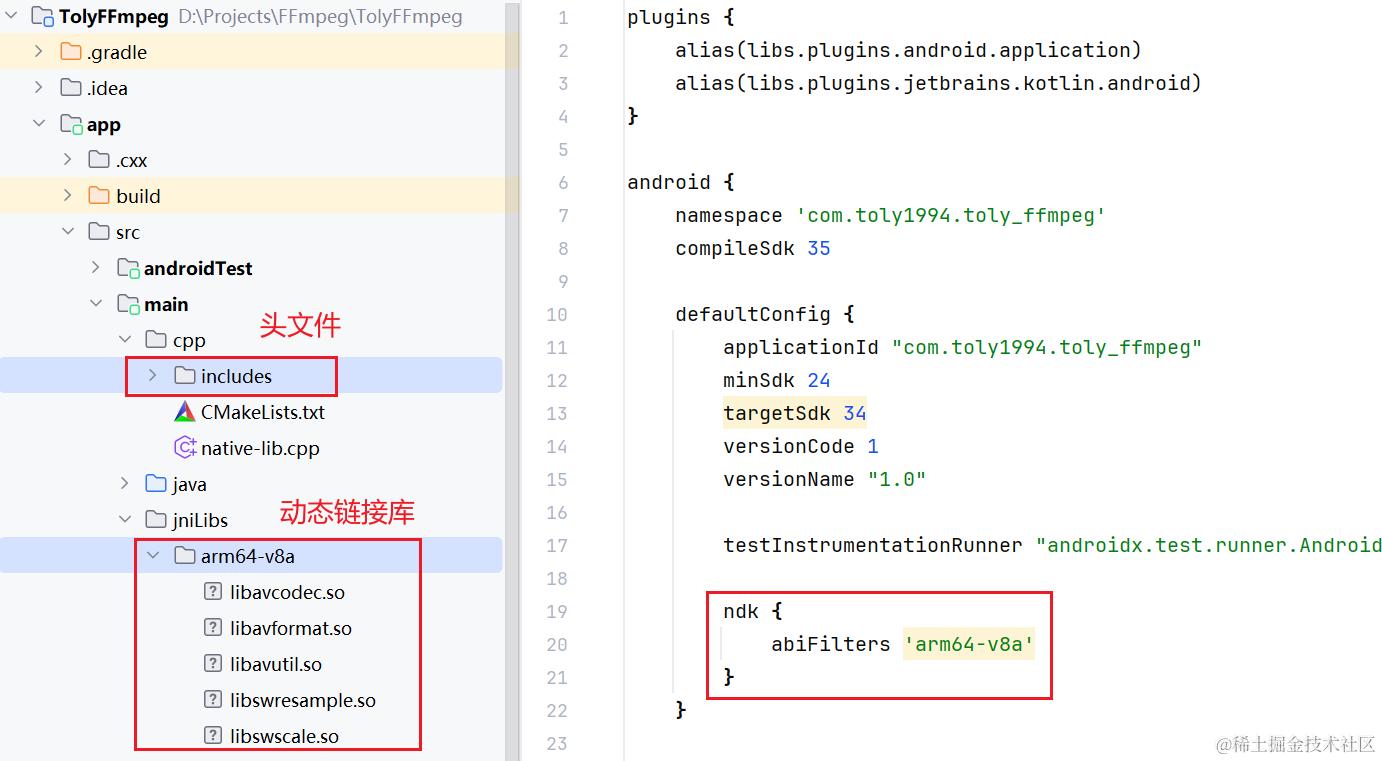 把生面产出的文件,放下项目的对应位置。由于只打包了 arm64 , 可以在 app/build.gradle 中的 defaultConfig 里指定 ndk 支持的架构: