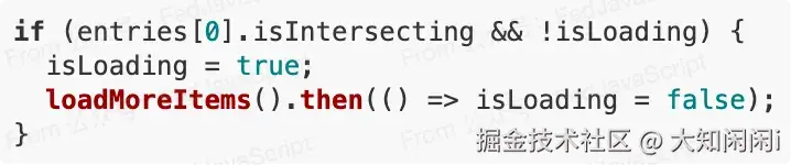 const observer = new IntersectionObserver(entries => { if (entries[0].isIntersecting && !isLoading) { isLoading = true; loadMoreItems().then(() => isLoading = false); }});observer.observe(document.querySelector('#sentinel'));