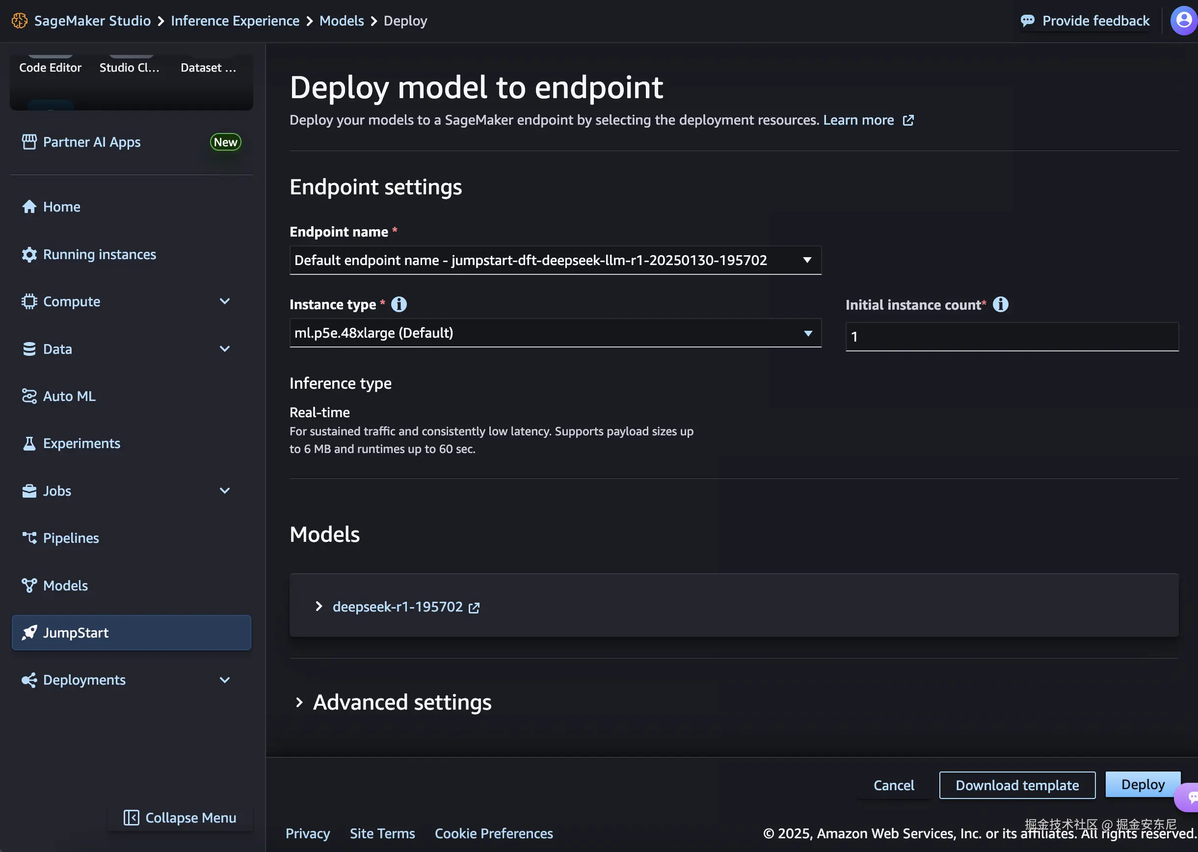 打开控制台,搜索 DeepSeek,订阅后直接部署 endpoint,选好实例类型就能用,支持 VPC、权限控制、加密等企业级配置。适合不想管部署细节、希望快速嵌入业务的团队。