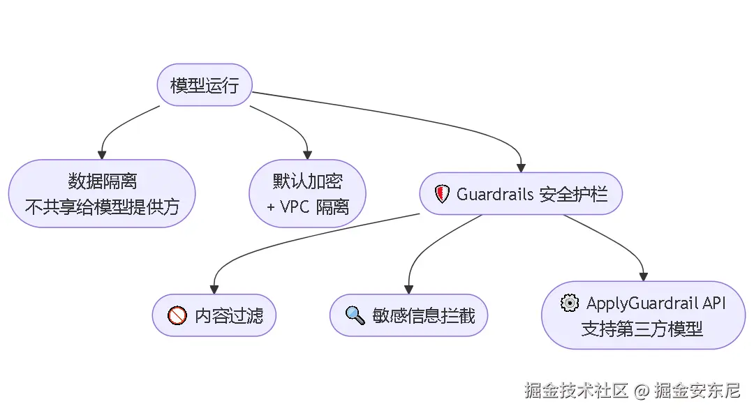 Bedrock 和 SageMaker 支持 Guardrails(安全护栏) ,可以过滤不当内容、拦截敏感信息,确保模型输出符合企业安全和合规要求。支持 decouple 的 ApplyGuardrail API,即使用第三方模型也能配套使用,非常适合构建“可控”的 AI 应用。更重要的是:所有调用数据不会共享给模型提供方,只在用户和亚马逊云之间流通,数据默认加密,支持 VPC 隔离。对于做金融、医疗、政务等场景的团队,这一点太关键了。
